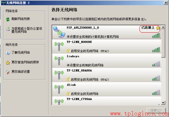 開啟PSP的WIFI開關(guān):WLAN。進(jìn)入游戲,選擇聯(lián)網(wǎng)模式。打開電腦的網(wǎng)絡(luò)連接---右鍵點(diǎn)擊無線網(wǎng)絡(luò)連接,選擇“查看可用的無線連接”,在當(dāng)前的可用的網(wǎng)絡(luò)列表中掃描到PSP,點(diǎn)擊連接,連接成功后能夠看到如下信息: