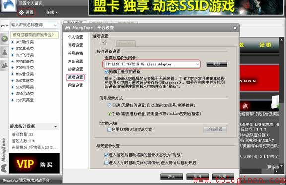 本文以盟區(qū)對(duì)戰(zhàn)平臺(tái)為例介紹PSP與WN721N V1無線網(wǎng)卡聯(lián)機(jī)游戲設(shè)置,其它對(duì)戰(zhàn)平臺(tái)下無線網(wǎng)卡端設(shè)置相同。